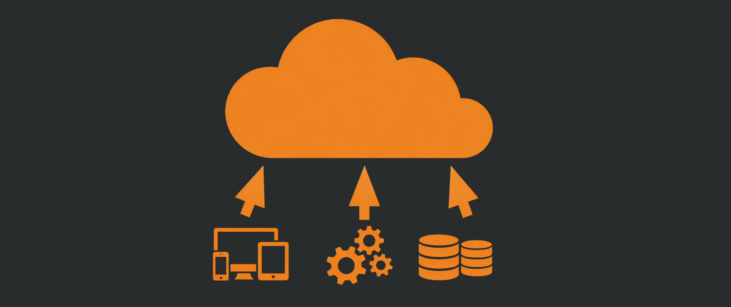 Cloud migraties illustratie met oranje cloud die apparaten, IT-systemen en databases verbindt.